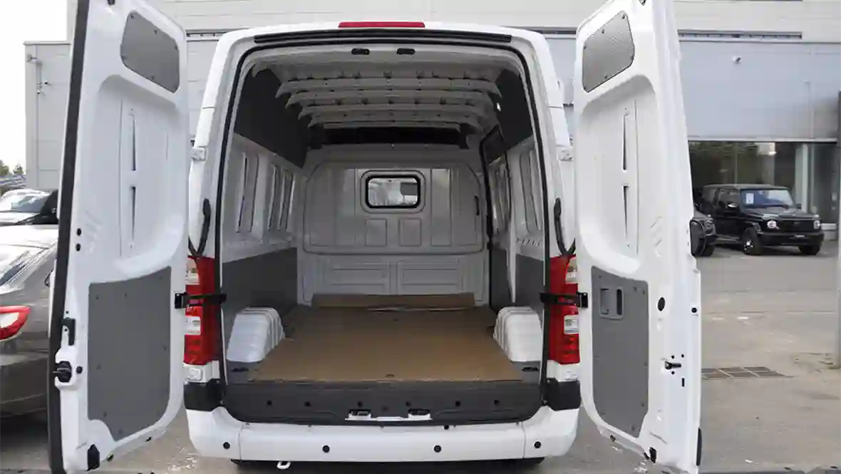 Внутренние размеры грузового отсека: 3070х1675х1666 мм, или до 9 кубов в пересчете на объем. Важная особенность нашего фургона — односкатная ошиновка. Это решение увеличивает полезный объем грузового отсека — арки колес не съедают внутреннее пространство. «Багажник» отделан пластиком и отделен от трехместной кабины металлической перегородкой. Для перевозки длинномеров в зоне под пассажирским сиденьем предусмотрена ниша. В полу есть проушины для крепления груза. Задние двери распахиваются на угол до 270°, а проем сдвижной боковой двери достаточно широк — это плюс.