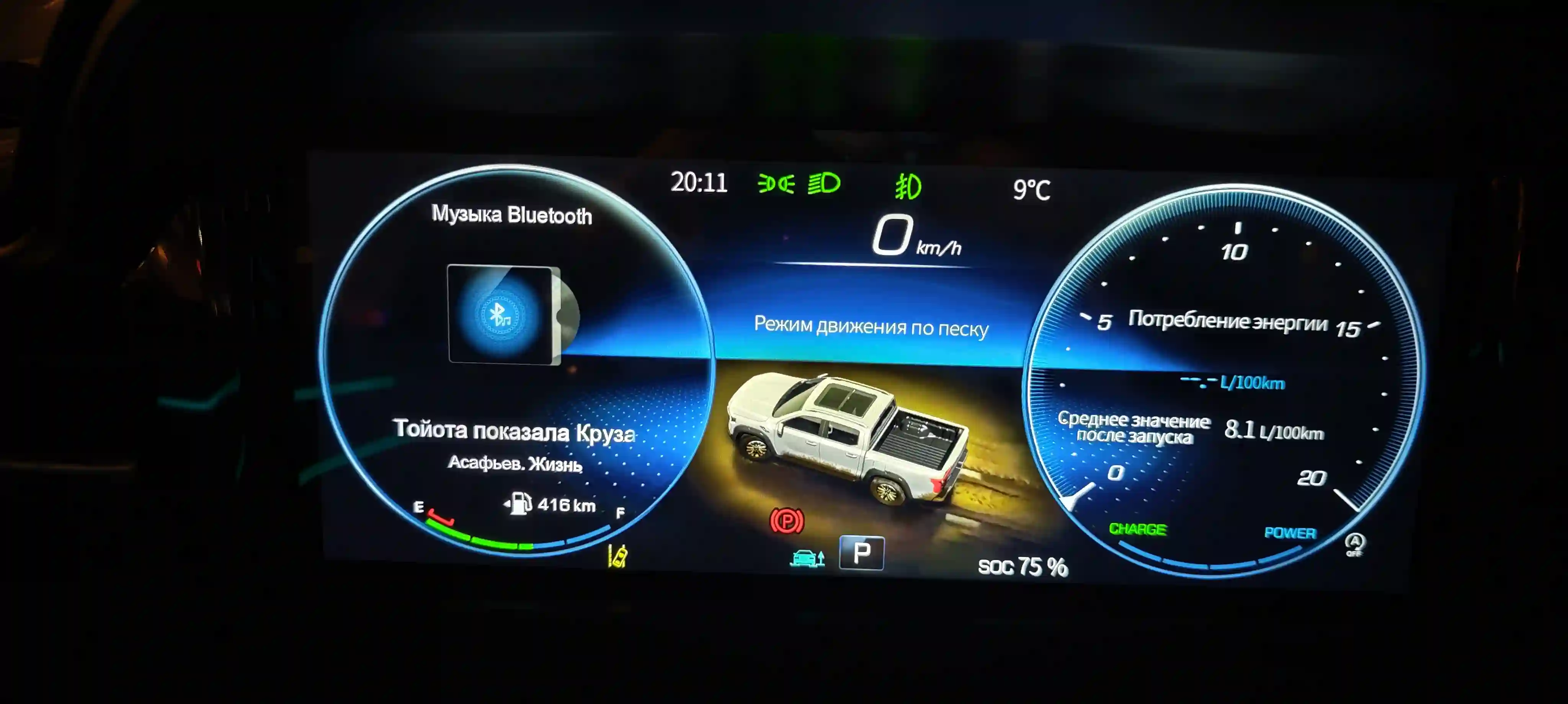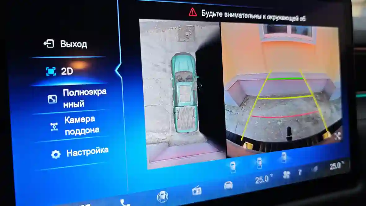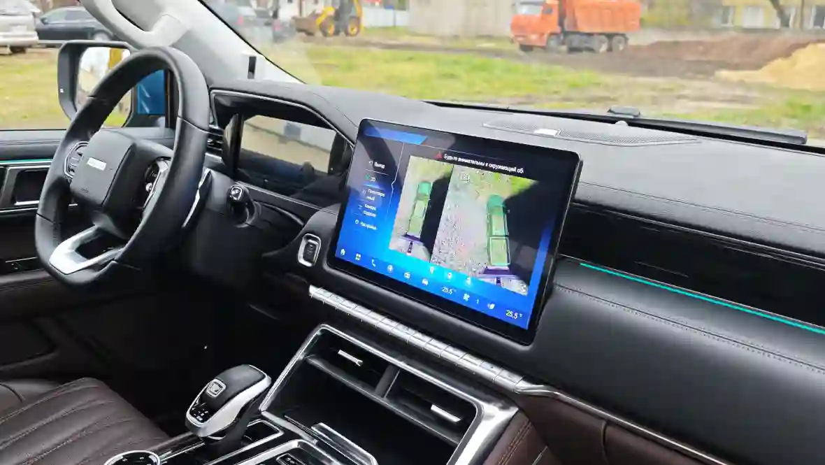 Они активируются автоматически при включении задней передачи или по кнопке на руле/экране, формируя на 14,6-дюймовом планшете виртуальную «птичью» проекцию машины сверху — идеально для парковки в тесных дворах или манёвров с прицепом. Важной особенностью системы стал режим «прозрачное шасси»: камеры накладывают изображение дороги под машиной, с наложением контуров рамы и колёс, что особенно полезно на бездорожье — видишь ямы, камни или лужи заранее, без слепых зон. Качество картинки приличное днём (HD-разрешение), но ночью или в дождь чуть зернистое.