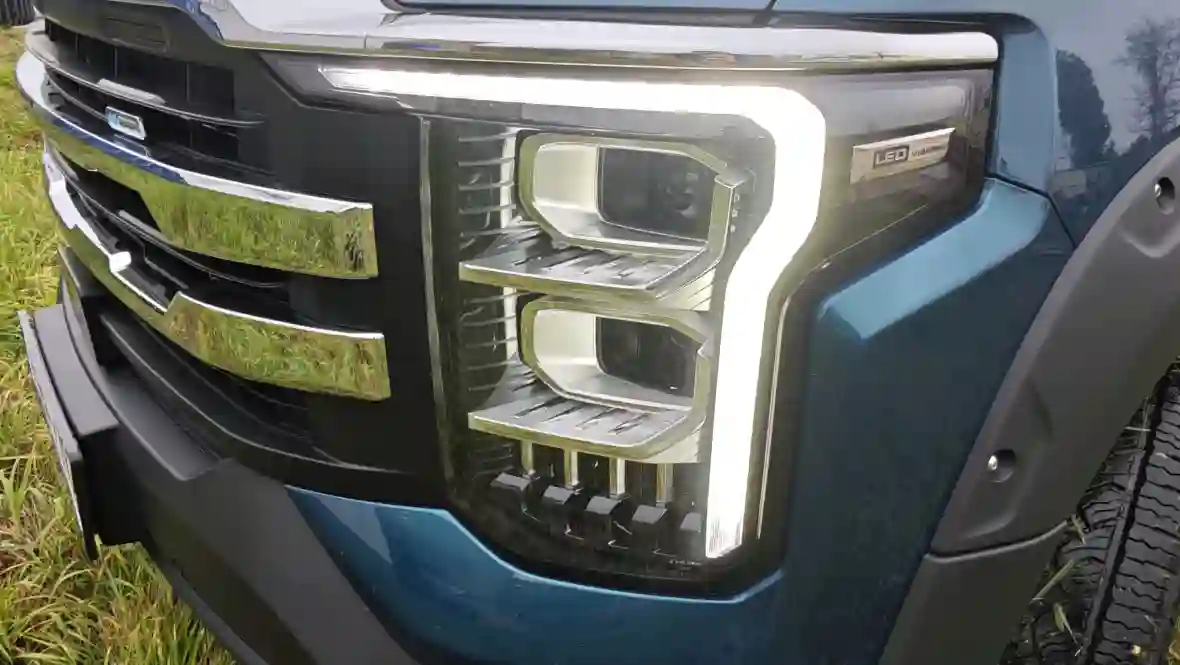 Она обрамлена выразительными чёрными акцентами, а по бокам её фланкируют раздельные LED-фары с четырьмя блоками — острые, как клинки, они обеспечивают не только отличный обзор, но и «хищный» взгляд, это делает пикап более заметным в потоке.