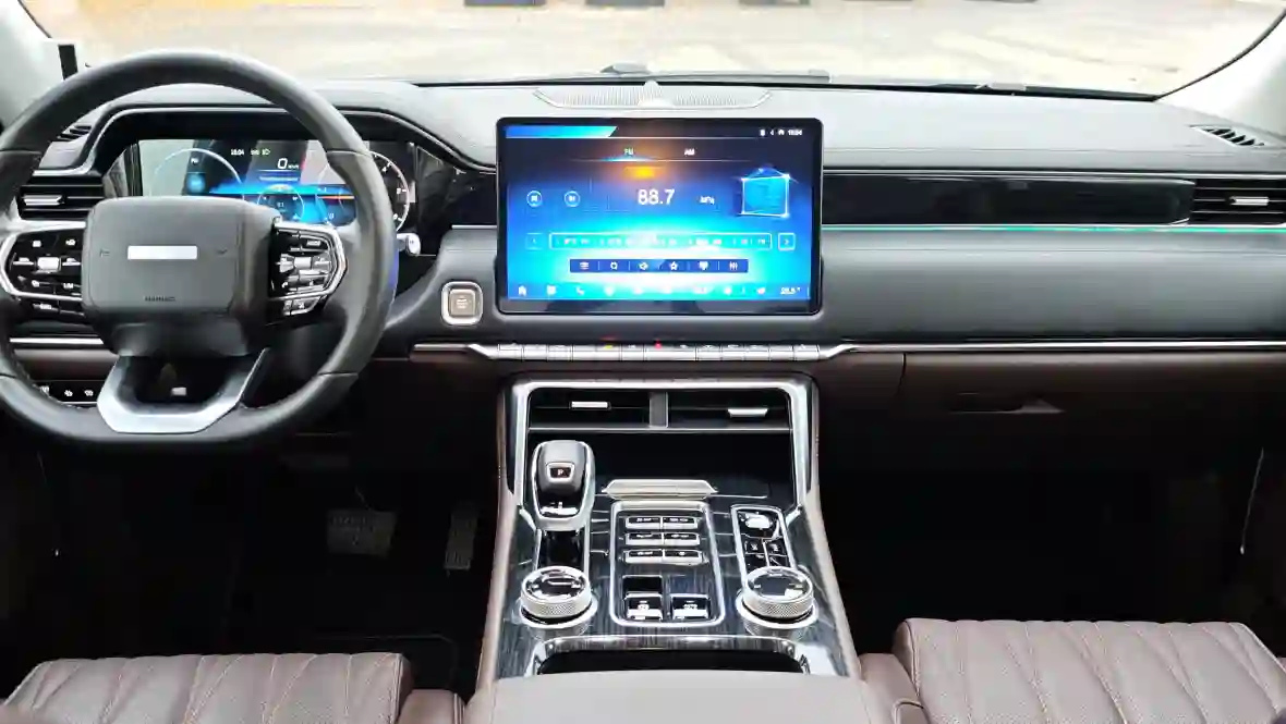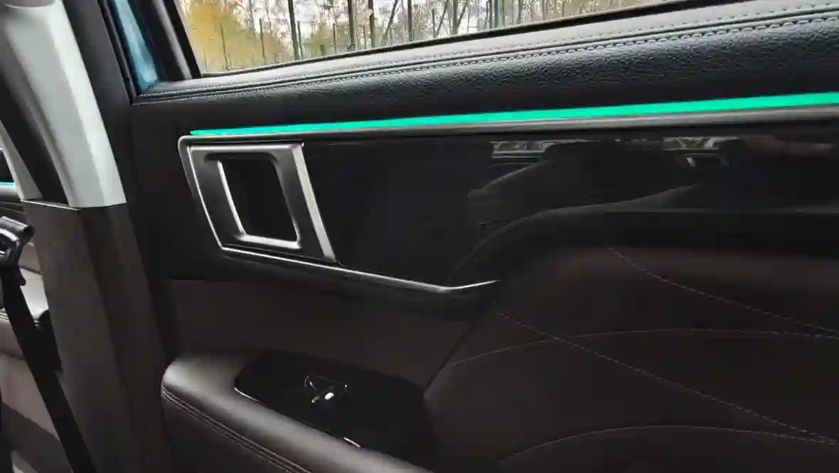 По материалам и восприятию качества — двойственное ощущение. С одной стороны, мягкий пластик на торпедо и дверных картах, простроченная кожа на сиденьях и руле, атмосферная подсветка, двухзонный климат, большой 14,6-дюймовый планшет и 12,3-дюймовая цифровая приборка — всё выглядит дорого и современно.