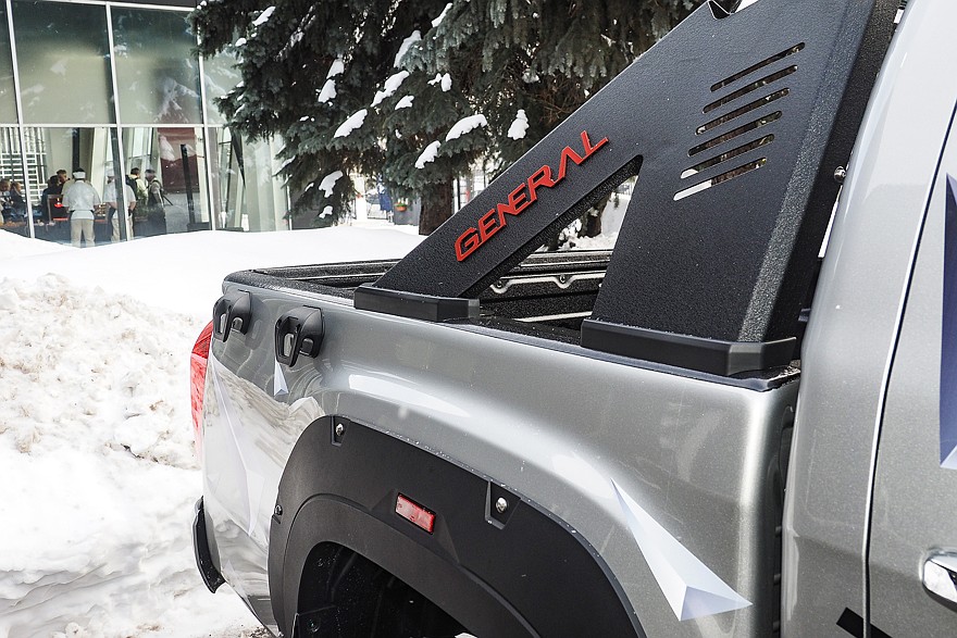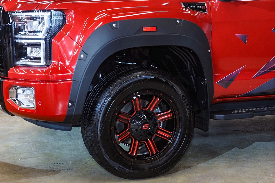 Сильней всего изменилось оформление передней части. Теперь она выполнена в стилистическом сходстве с TUNLAND V7, создатели которого в свою очередь явно посматривали на Ford F-150. Прямоугольные двухэтажные фары имеют несколько иную форму, но по-прежнему окаймлены полосками дневных ходовых огней. Крупная черная облицовка радиатора несет не менее крупный логотип FOTON, и тут сходство с G7 уже очевидно. Разве что буквы не хромированные, а красные с черной каймой. На боковые поверхности крыльев вернулись небольшие «псевдожабры» с надписью FOTON G. Передние и задние колесные арки получили накладки из неокрашенного черного AБC-пластика, закрепленные болтами с хромированными головками. Передний бампер явно выглядит куда более защищенным от внешних воздействий, нежели полностью окрашенный бампер G7. А вот ситуация с задним бампером диаметрально противоположная: у TUNLAND G7 он был неокрашенным, а у G9 он одного цвета с кузовом. Изменилось и оформление заднего борта – с него исчезла черная пластиковая накладка с логотипом. Сама же грузовая площадка серьезных изменений не претерпела: те же внутренние габариты 1520×1580×440 мм, такие же массивные крюки для фиксации грузов на внешней стороне бортов и штатное пластиковое покрытие внутри. И практически такая же дуга безопасности, зрительно делающая силуэт автомобиля похожим на седан.