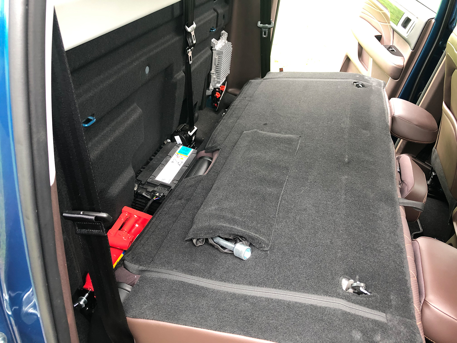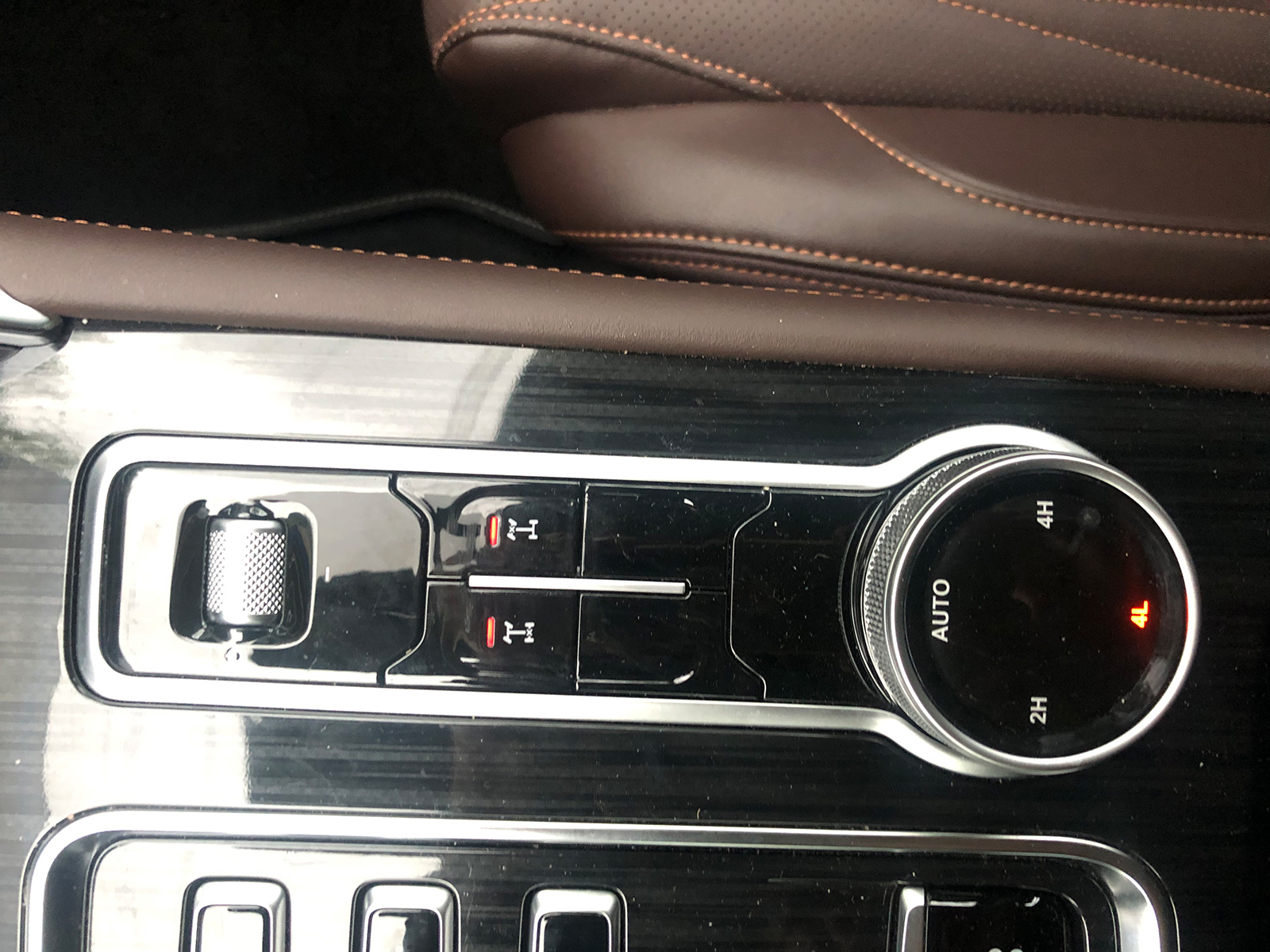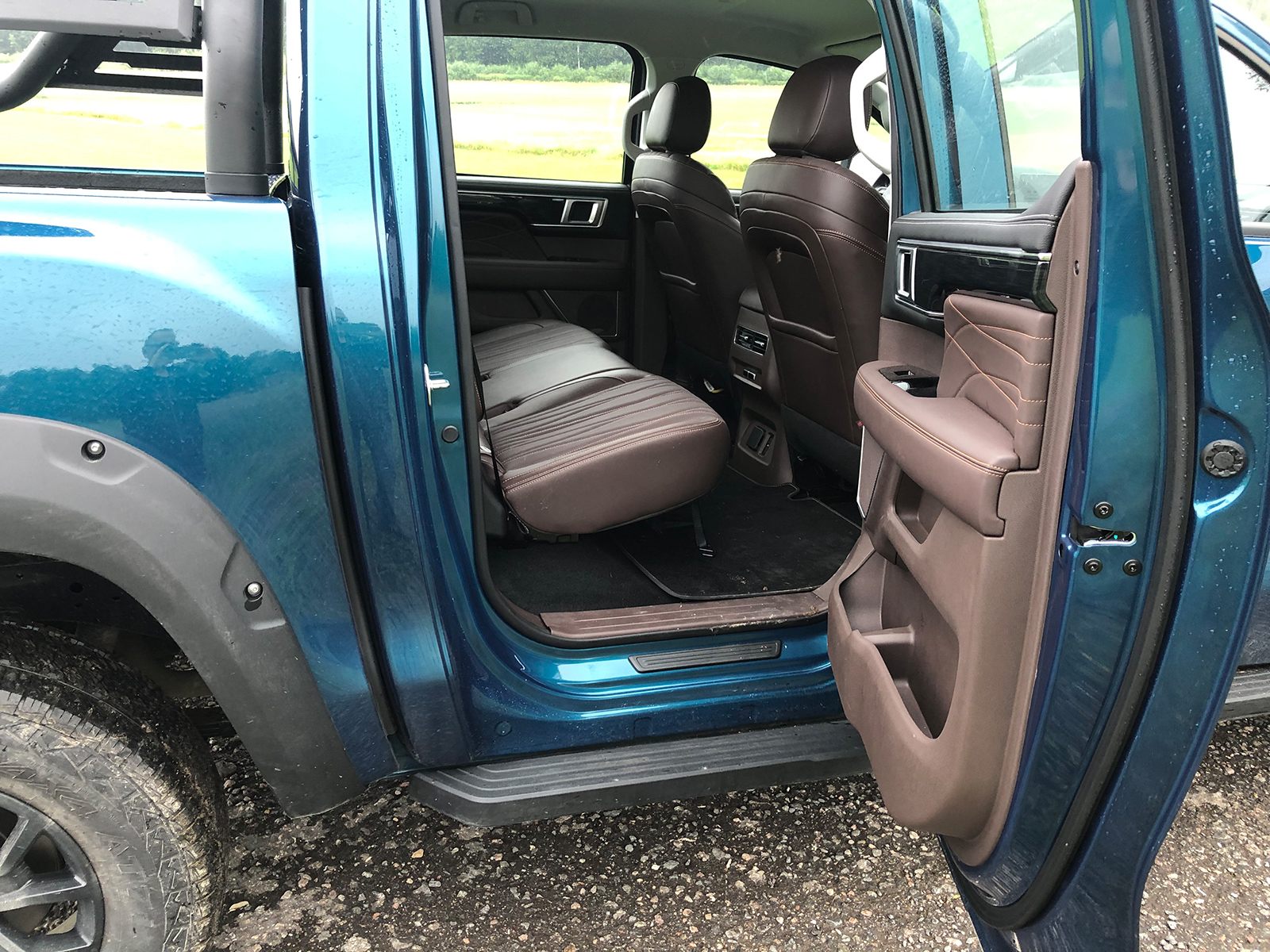 По динамике разгона TUNLAND V7 не дотягивает, конечно, до американского пикапа с V8 или даже V6, но она достаточная. У коробки есть ручной режим и подрулевые переключатели, но в повседневной езде хватает автоматического, режимы работы раздаточной коробки – 2H, Auto, 4H, 4L – выбираешь, вращая «шайбу» на правой стороне центрального тоннеля, последний, как положено, включается только, когда селектор КПП в положении N. И тогда TUNLAND V7 ползет по пересеченной местности, как тихоходный, но мощный трактор. Левая «шайба» – выбор режимов движения: Eco, Normal, Sport, Sand, Snow, Off-Road. Возможную недостаточность крутящего момента при разгоне и не только сглаживает электромотор.
