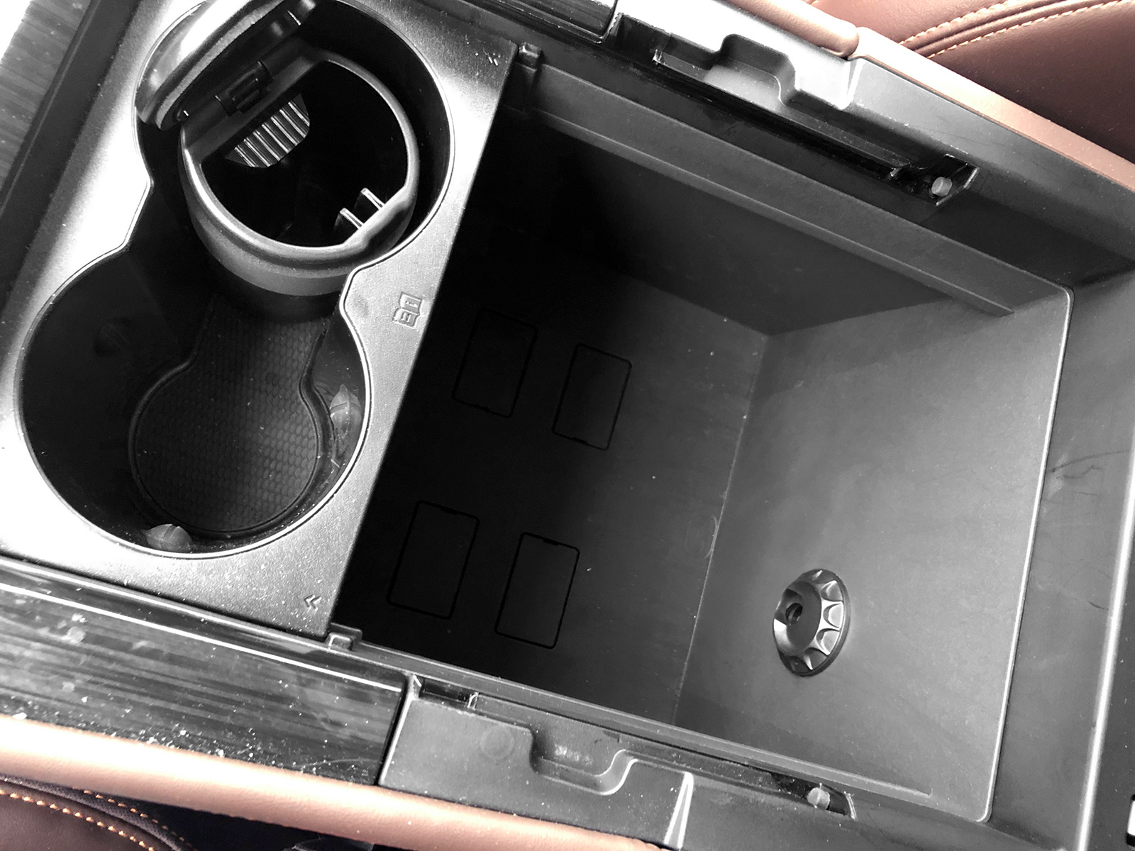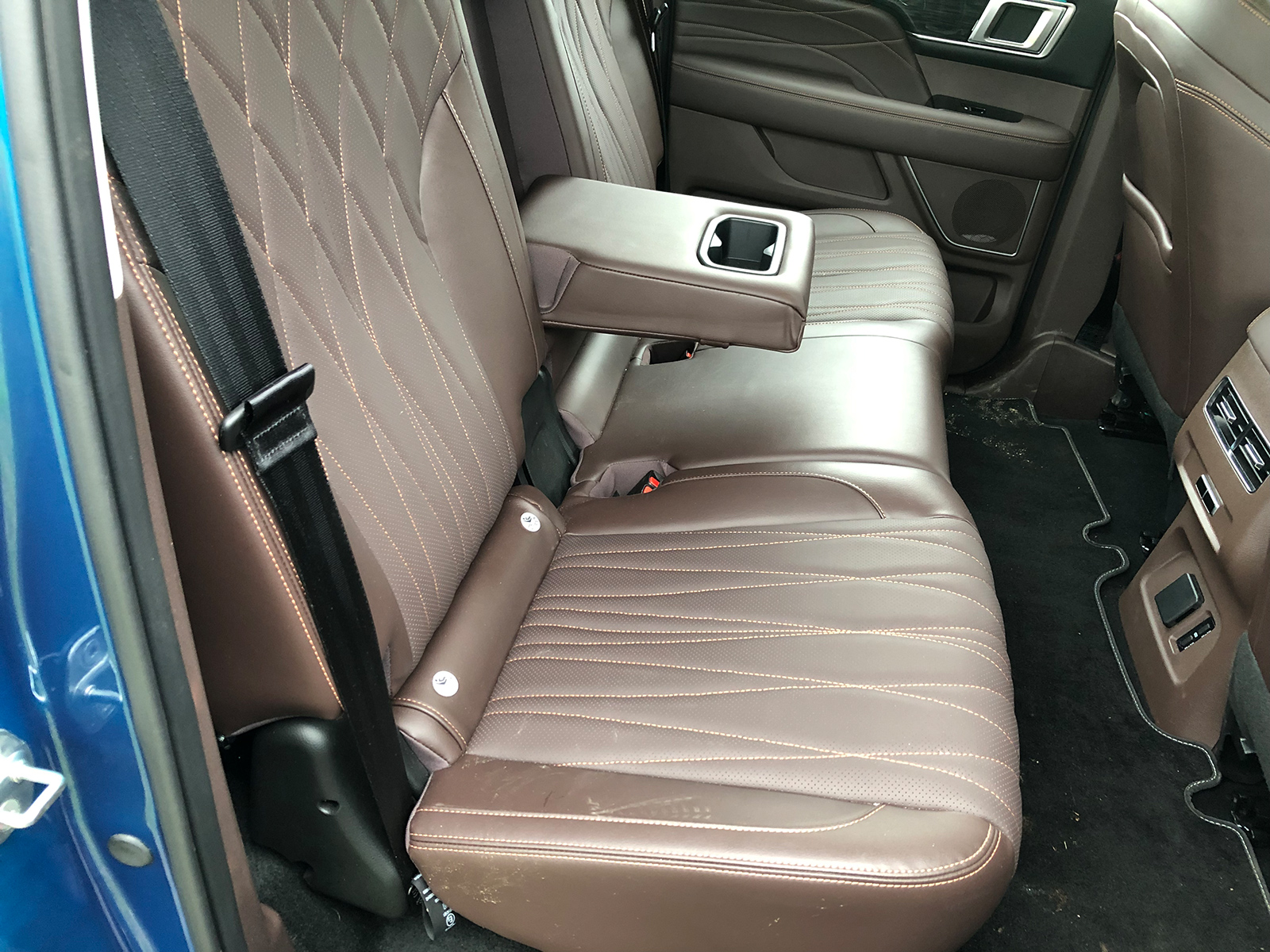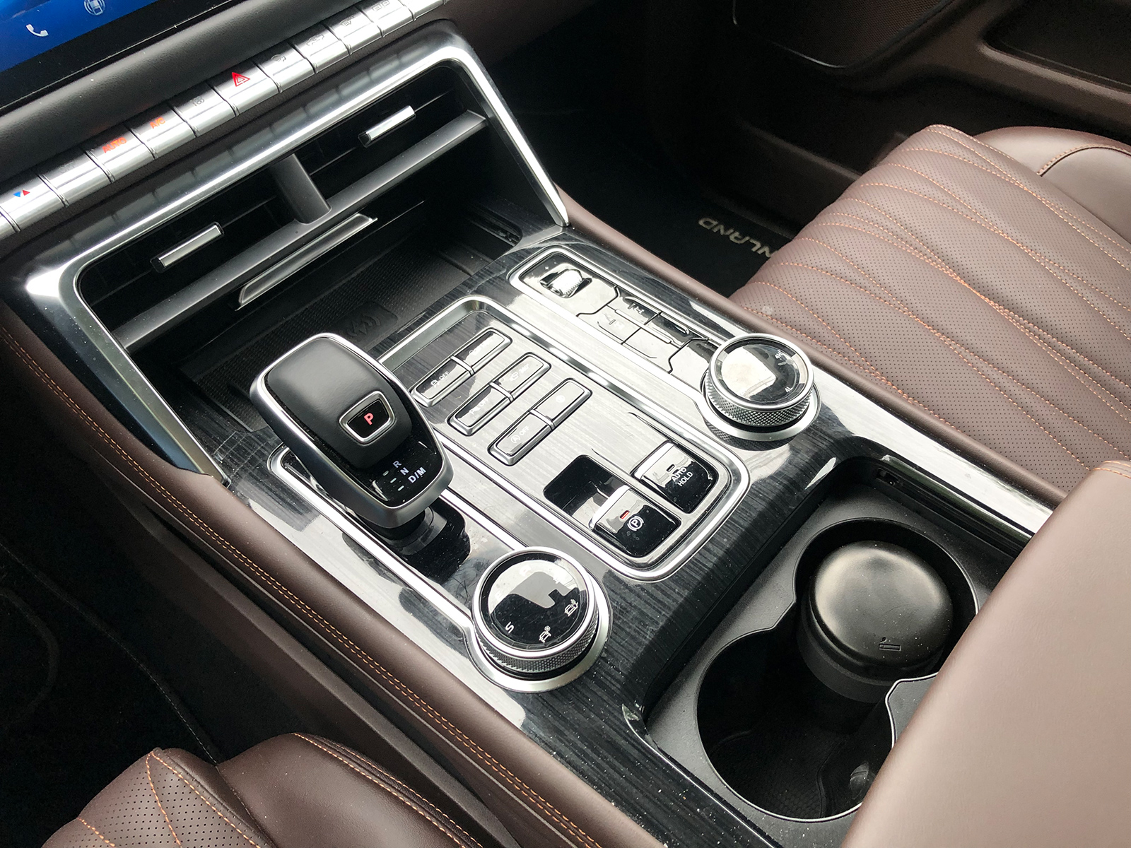 Но забираешься в салон, в чем помогают мощные подножки и рукоятки на каждой из четырех стоек, – и находишь комфорт статусного внедорожника. Автомобиль по-американски просторный. Мягкий коричневый кожзам широких сидений с ромбовидной прострочкой, подогревом и вентиляцией. Два современных дисплея – приборной панели и экрана мультимедиа, оба с отличной четкой картинкой, графикой и шрифтами, похожие на те, что используются в Mercedes-Benz. Есть поддержка Apple CarPlay, панель беспроводной зарядки телефона. Отделка широкой центральной консоли под лакированное темное дерево, алюминиевые вставки. В нише под консолью – USB-разъем и – редкость по нынешним временам – прикуриватель в розетке 12V, которому соответствует вставная герметичная пепельница в одном из подстаканников. Задний ряд сидений – с широким плоским диваном и плоским полом, так что удобно сидеть втроем. Подогревы заднего ряда – опция, как и панорамная крыша.