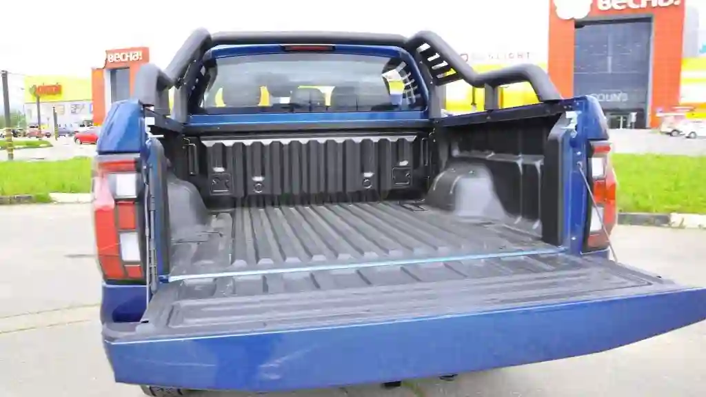 На передней панели есть два дисплея: один приборной панели, другой, диагональю 14,6 дюймов, заведует мультимедиа. В машине соблюден приемлемый баланс между физическими кнопками и виртуальными приборами. Покопавшись в них, можно посмотреть даже температуру трансмиссионного масла! У пикапа хорошая шумоизоляция, по старинке, на слух, проверить работу коробки не получится. Зато отправляясь в путь, можно быть уверенным — если что, на помощь придут многочисленные электронные системы безопасности, а также шесть эйрбегов.