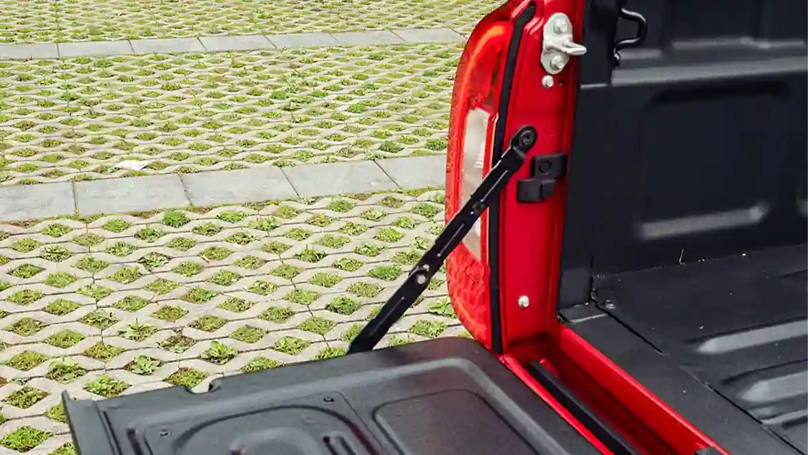 Задний бампер из неокрашенного пластика выглядит вполне надежной защитой. В средней его части есть выемка под номерной знак, которая одновременно служит ступенькой, облегчающей доступ к размещенному на платформе грузу в ситуациях, когда вы по каким-то причинам не хотите откидывать задний борт. Тут есть одна деталь: замок откидного борта не подключен к системе центрального запирания, и чтобы его открыть или закрыть, нужно выколупать ключ из брелока. Зато на откидной борт можно грузить тяжелые вещи без особой опаски, а также использовать его в качестве скамейки – борт рассчитан на нагрузку в 200 кг, и удерживает его в горизонтальном положении надежная система подвижных кронштейнов.