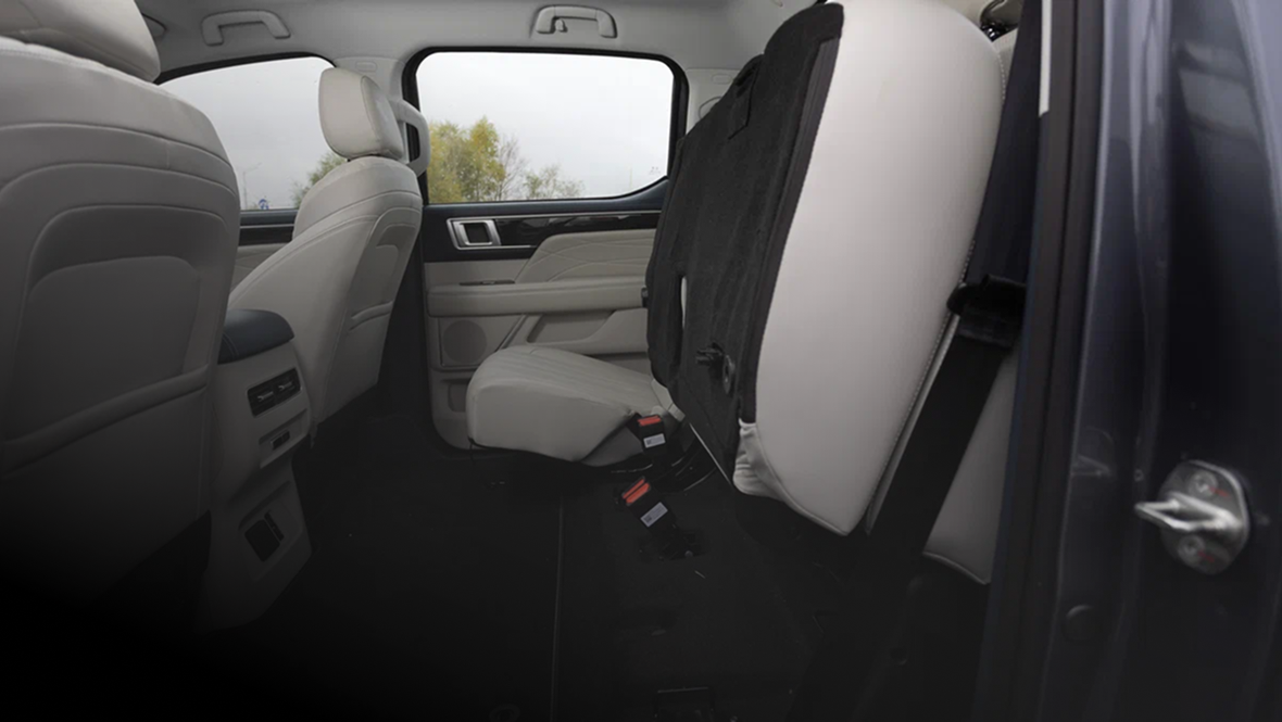 Задний диван FOTON TUNLAND V7 плоский и с вертикально установленной спинкой: посадку можно назвать комфортной лишь условно — удобную позу подобрать сложновато. Чуть выручают мягкий центральный подлокотник с подстаканниками и огромный запас свободного пространства для ног.
