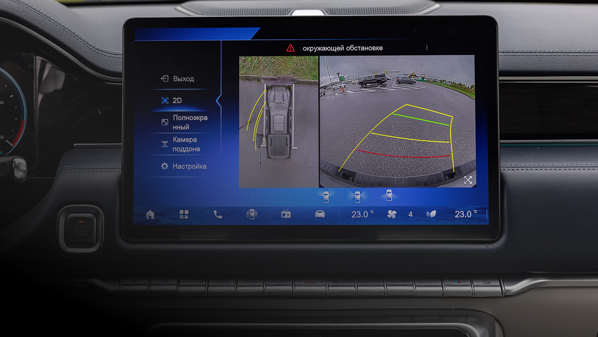Порадовала достаточно удобная посадка. Руль настраивается как по углу наклона, так и по вылету, у сиденья — удачные плотность набивки и профиль, есть регулировка поясничного подпора и полный набор электроприводов. Длина подушки традиционно для китайских автомобилей маловата, но это особо не мешает. Да и с обзорностью нет никаких проблем: габариты массивного пикапа хорошо чувствуются, а огромные зеркала заднего вида очень помогают.
